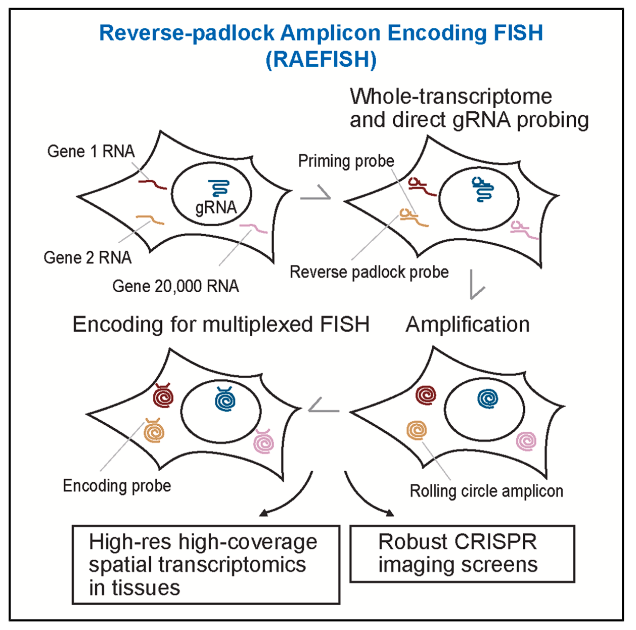 이 논문은 이러한 간극을 메우기 위해 RAEFISH(Reverse-padlock Amplicon-Encoding FISH) 라는 새로운 이미징 기반 공간 전사체 기술을 제시합니다. 핵심은 패들록(padlock) 올리고의 구조를 역전시켜 증폭 효율을 높이고, 수만 개 유전자를 한 번에 탐지할 수 있게 한 점입니다. RAEFISH는 별도의 시퀀싱 없이도 2만 개 이상의 유전자를 단일 분자 수준으로 시각화하며, CRISPR 실험에서 gRNA를 직접 검출할 수도 있습니다.
